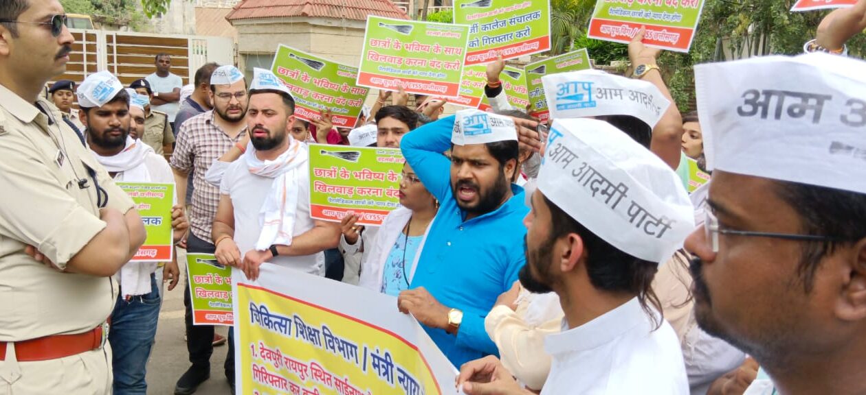 पैरामेडिकल छात्रों को न्याय दिलाने आप यूथ विंग / CYSS का चिकित्सा शिक्षा मंत्री श्री टी. एस. सिंहदेव के आवास के सामने विरोध प्रदर्शन ।