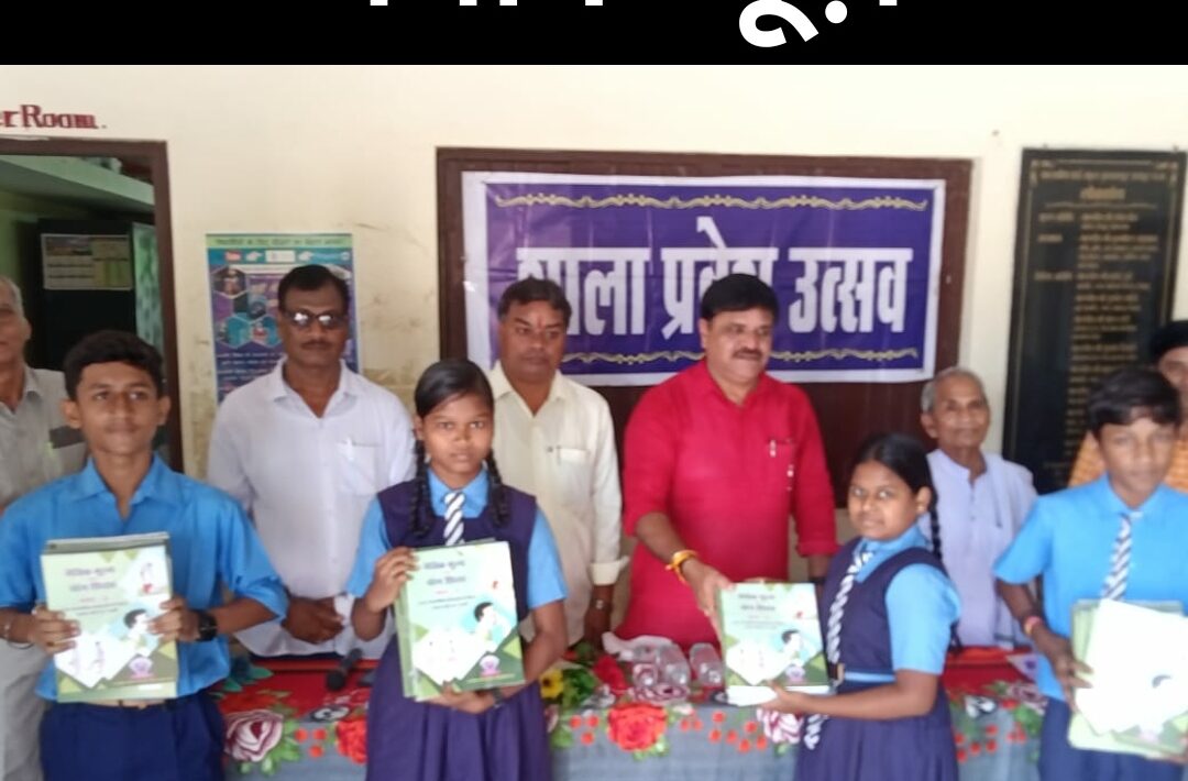 सभापति प्रमोद दुबे द्वारा कुशालपुर स्थित हायर सेकेंडरी स्कूल शाला प्रवेश उत्सव में बच्चों को ड्रेस एवं किताबों का वितरण किया ।।