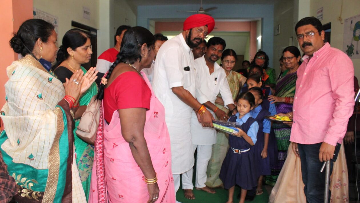 शाला प्रवेश उत्सव में बच्चों के बीच बैठे विधायक जुनेजा बच्चों को बांटी पुस्तकें पेन व यूनिफॉर्म