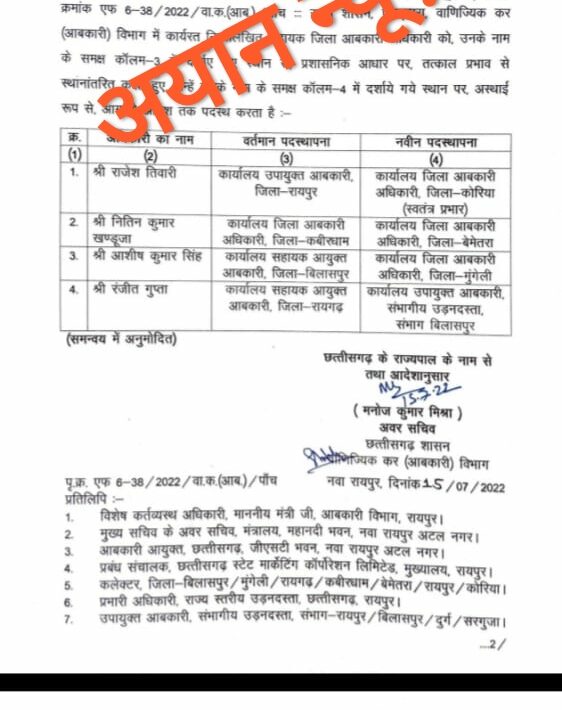 रायपुर,आबकारी विभाग के कई जिलों के अधिकारियों का तबादला देखें आदेश की कापी,