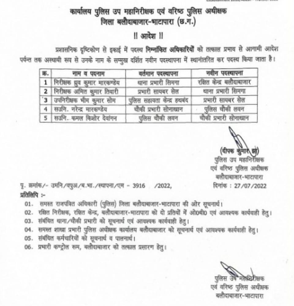ट्रांसफर ब्रेकिंग:-एसपी ने 2 टीआई 1एसआई,2 एसएसआई का किया तबादला देखें आदेश की कापी, रायपुर,बलौदाबाजार एसपी दीपक झा ने आज जिले में पदस्थ, 2 टीआई,1 एसआई, और 2 एएसआई का तबादला आदेश जारी किया है जो इस प्रकार है