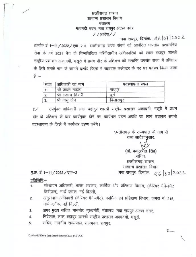 रायपुर, ट्रेनिंग के बाद आईएएस अफसरों को मिली पहली पदस्थापना… रायपुर,दुर्ग, बिलासपुर भेजे गये…देखें आदेश की कापी,