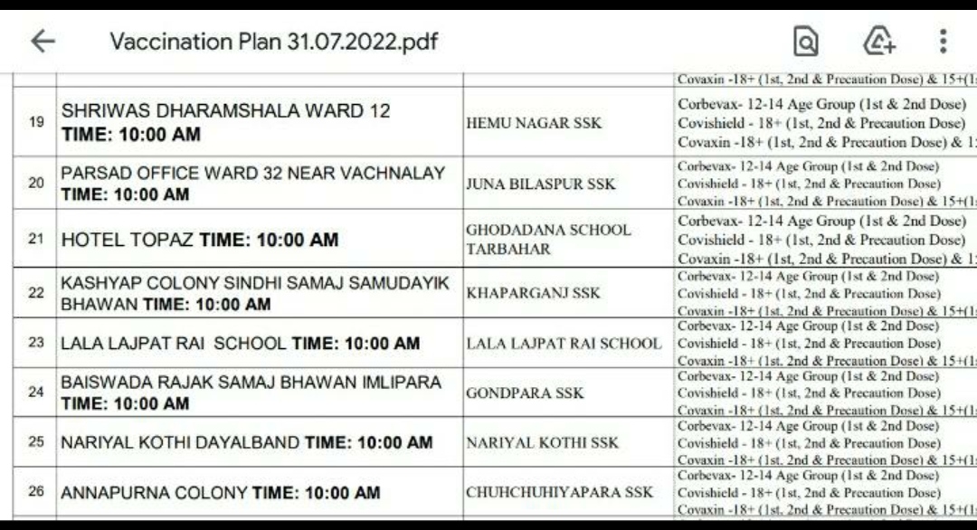 बिलासपुर गणेश नगर चुचुहियापारा वार्ड क्रमांक 46 पार्षद इब्राहिम अब्दुल खान के सहयोग से सभी वार्डवासियो के स्वास्थ्य सुरक्षा को ध्यान मे रखते हुए कोविड-19 के बढ़ते संक्रमण व उससे बचाव हेतू स्वास्थ्य विभाग व नगर निगम के द्वारा वैक्सीन सेंटर बनाया गया है।यहा कोविड-19 व बूस्टर डोज की वैक्सीन भी लगाया जायेजा। समय सुबह 10 बजे से शाम 4 बजे तक होगा स्थान अन्नपूर्णा कॉलोनी सामुदायिक भवन मे लगेगा।