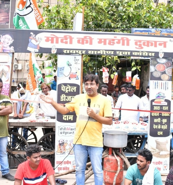 रायपुर— बढ़ती महंगाई को लेकर रायपुर ग्रामीण के युवा कांग्रेसियों ने आज महंगाई की दुकान लगाकर अनोखा प्रदर्शन किया लगातार बढ़ती महंगाई को लेकर युवा कांग्रेस का यह प्रदर्शन काफी अनोखा रहा और उन्होंने विस्तृत रूप से बढ़ती महंगाई को लेकर लोगों को जानकारी दी। युवा कांग्रेस के पदाधिकारियों ने जानकारी देते हुए बताया कि लगातार महंगाई की मार जनता के ऊपर पढ़ रही है दही, पनीर जैसे चीजों पर जीएसटी लगाकर जनता को परेशान किया जा रहा है 10 रूपए की चीज जीएसटी लगने के बाद 13 और15 रूपए तक मिल रही है जिधर देखें उधर महंगाई की मार नजर आती है पहले गैस सिलेंडर, पेट्रोल, डीजल के दाम लगातार बढ़ते गए और आदमी की पहुंच से बाहर होती नजर आई जीएसटी लगने के बाद कहीं ना कहीं खाद्य सामग्रियों में भी महंगाई का असर दिखने लगा है।
