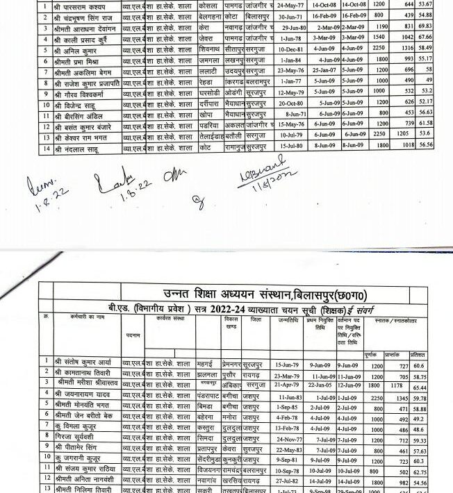 उन्नत शिक्षा अध्ययन संस्थान बिलासपुर में सत्र 2022-24 में बी.एड.(द्विवर्षीय) विभागीय प्रशिक्षण करने हेतु ई. एवं टी. संवर्ग तथा ई. एल. बी. एवं टी.एल.बी. संवर्ग के अभ्यर्थियों से प्राप्त दावा-आपत्ति के निराकरण पश्चात आज दिनांक 01/08/2022 को 75 शासकीय शिक्षकों का चयन कर अंतिम सूची जारी की जा रही है ।