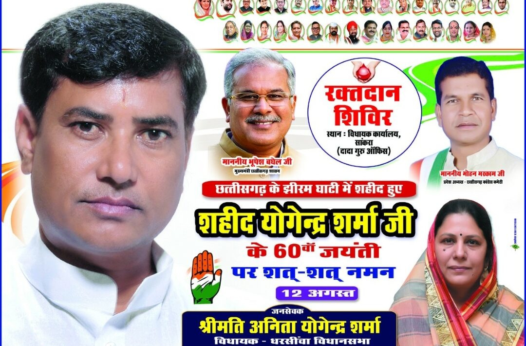 रायपुर,झीरम घाटी में हुए शहीद योगेंद्र शर्मा के 60 वीं जयंती पर रक्तदान शिविर का आयोजन, धरसीवां के सांकरा में,