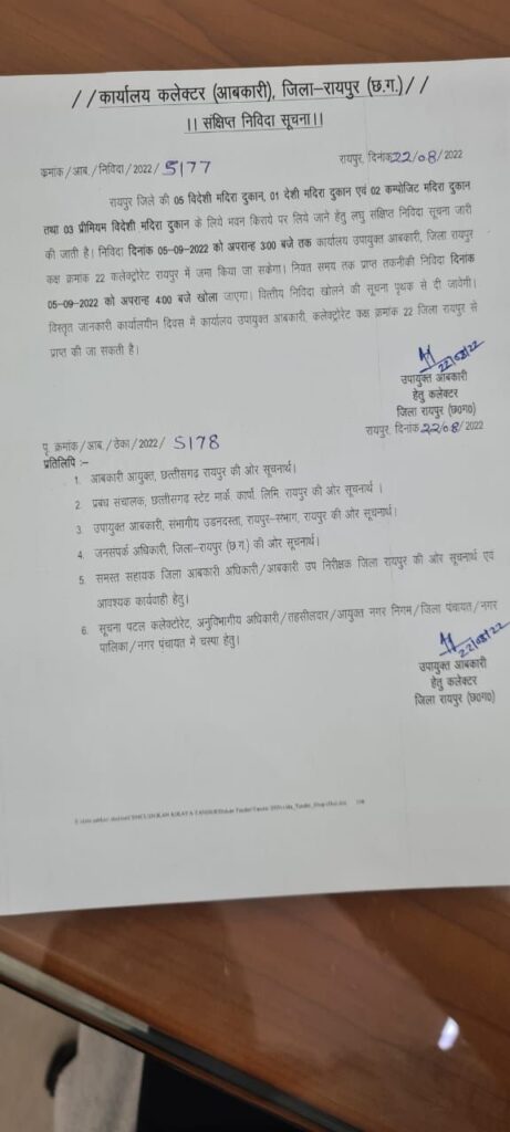 मुख्यमंत्री के निर्देश पर तेज़ी से अमल करते हुए आज उपायुक्त आबकारी ने तेलीबांधा में कृष्ण कुंज के समीप संचालित प्रीमियम विदेशी मदिरा दुकान और विदेशी मदिरा दुकान को हटाकर अन्यत्र स्थानांतरित करने के लिए निविदा जारी की है। निविदा के माध्यम से इन दुकानों सहित रायपुर जिले की चार और विदेशी मदिरा दुकानों, एक देसी मदिरा दुकान, दो कंपोजिट मदिरा दुकानों और दो अन्य प्रीमियम विदेशी मदिरा दुकानों को भी स्थानांतरित करने आवेदन मंगाए गए है। निविदा पत्र पांच सितंबर 2022 तक आबकारी उपायुक्त कार्यालय कमरा नंबर 22 कलेक्टोरेट रायपुर में दोपहर तीन बजे तक जमा कराए जा सकते है। तकनीकी निविदा पत्र छह सितंबर 2022 को अपराह्न चार बजे खोले जाएंगे। वित्तीय निविदा खोलने की सूचना अलग से दी जाएगी। अधिक जानकारी के लिये आबकारी उपायुक्त कार्यालय, कलेक्टोरेट परिसर कमरा नंबर 22 में संपर्क किया जा सकता है।