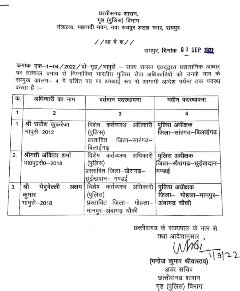 वहीँ सांरगढ़-बिलाईगढ़ का पुलिस अधीक्षक का प्रभार राजेश कुकरेजा को दिया गया है,अंकिता शर्मा को पुलिस अधीक्षक खैरागढ़,छुईखदान गंडई की जिम्मेदारी दी गई है,येदुवेल्ली अछ्य कुमार को पुलिस अधीक्षक