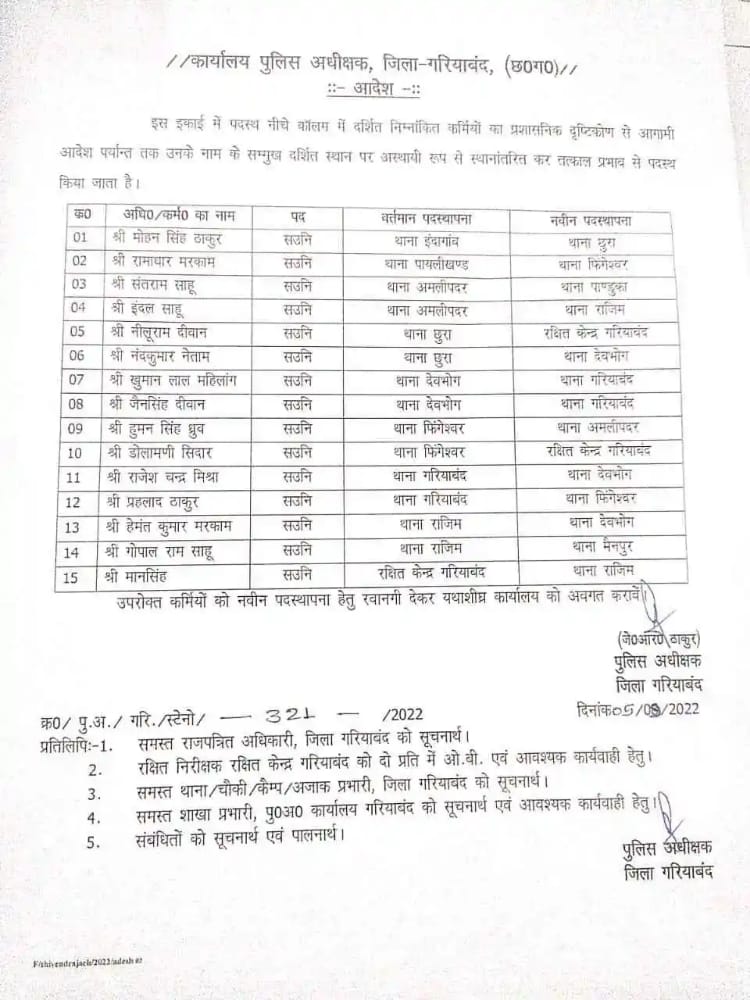 गरियाबंद,पुलिस विभाग में लगातार तबादलों का सिलसिला जारी है.गरियाबंद एसपी जे आर ठाकुर ने फिर 15 एएसआई का तबादला आदेश जारी किया है. बताया जा रहा कि लंबे समय से एक ही थाने में पदस्थ एएसआई को इधर से उधर भेजा गया है।