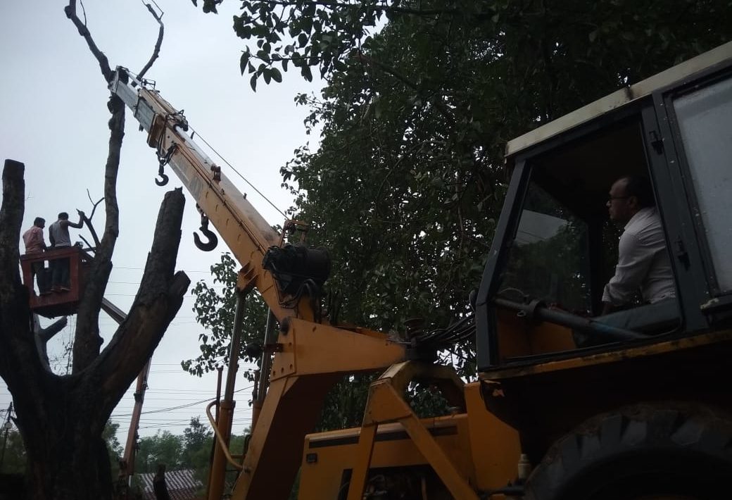 निगम कर्मचारी से कहकर क्रेन भिजवाकर पीड़ित परिवार के मकान के ऊपर गिरे पेड़ को काट कर किया गया अलग