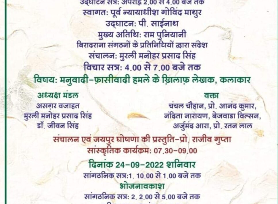 उन्होंने बताया कि जलेसं के इस सम्मेलन का उदघाटन प्रसिद्ध पत्रकार पी. साईनाथ करेंगे, जबकि अध्यक्षता असगर वज़ाहत, मुरली मनोहर सिंह और जीवन सिंह करेंगे। अपने सांप्रदायिकता विरोधी लेखन के लिए चर्चित राम पुनियानी सम्मेलन के मुख्य अतिथि होंगे। लेखकों-संस्कृतिकर्मियों के इस तीन दिनी समागम को चंचल चौहान, आनंद कुमार, नंदिता नारायण, रतनलाल, बेंजवाड़ा विल्सन जैसे कई बुद्धिजीवी संबोधित करेंगे।