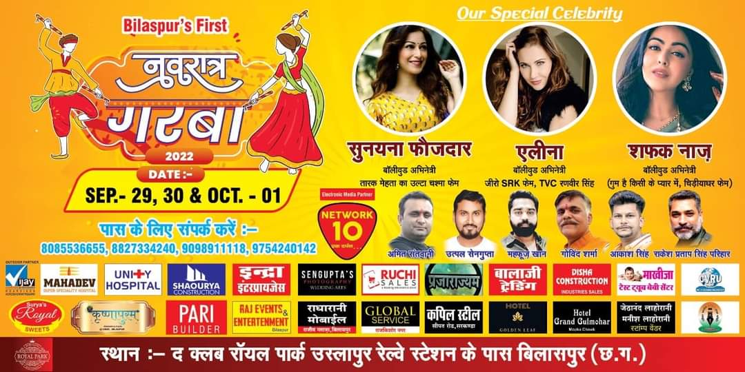 आज से तीन दिन शहर में जबरदस्त आयोजन का इंतज़ार अब खत्म होगा। शाम को 7 बजे से गरबा का भव्य आयोजन शुरू होगा और तारक मेहता का उल्टा चश्मा फेम सुनयना फौजदार उपस्थित रहेगी।