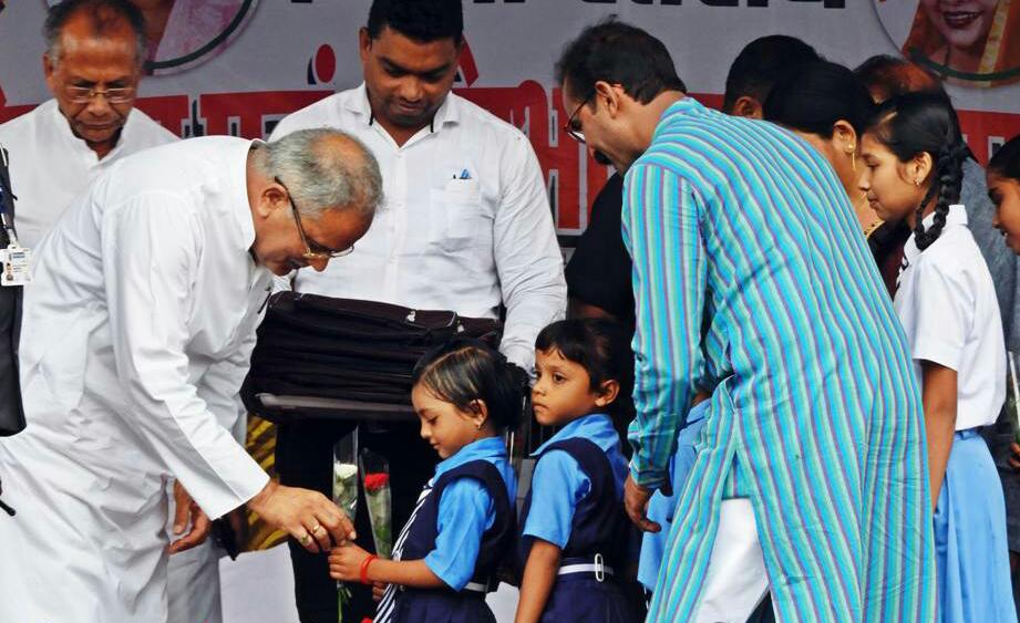 रायपुर-मुख्यमंत्री भूपेश बघेल आज बालोद जिले के नगर पंचायत अर्जुन्दा के शासकीय उच्चतर माध्यमिक शाला के प्रंागण में आयोजित शाला प्रवेशोत्सव एवं प्रतिभा सम्मान समारोह में शामिल हुए। उन्होंने स्कूल के नवप्रवेशी छात्र-छात्राओं का तिलक लगाकर, मुॅह मीठा कराकर और पाठ्य पुस्तक सहित स्कूल बैग प्रदान कर उनका स्कूल में स्वागत किया तथा उनके उज्जवल भविष्य की शुभकामनाएॅ दी।