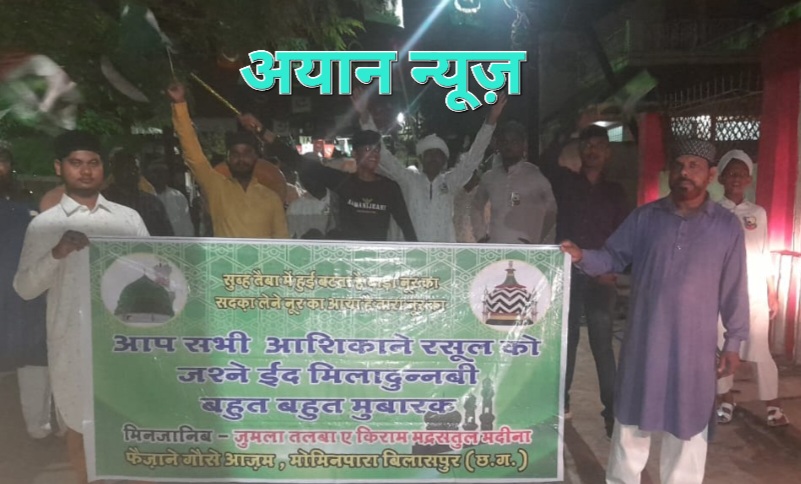 अयान न्यूज मनीष पाल की कलम से गणेश नगर मे निकाली गई ईद मिलादुन नबी पर जुलूस। बिलासपुर गणेश नगर के फैजाने गौसे आजम मोमिनपारा द्वारा ईद मिलादुन नबी के मौके पर जुलूस निकाला गया,अमन चैन का पैगाम भी दिया गया। मोहल्ले व चौक चौराहो को भी सजाया जा रहा है।