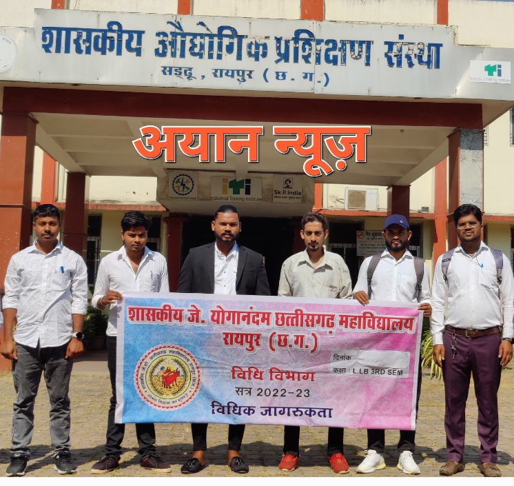 रायपुर। शासकीय जे. योगानंदम छत्तीसगढ़ महाविद्यालय रायपुर के विधि विभाग के छात्रों द्वारा शासकीय औद्योगिक प्रशिक्षण संस्थान में विधिक जागरूकता कार्यक्रम का आयोजन कर शुद्ध पर्यावरण एवं स्वच्छ जल विषय पर जागरूक किया गया। कार्यक्रम में मुख्य रूप से रश्मी वर्मा, राघवेंद्र सिन्हा प्रशिक्षण अधिकारी कूपा, मेजर नरेन्द्र उपाध्याय व अन्य शिक्षिक – शिक्षिकायें व छात्र शामिल हुए। कार्यक्रम का आयोजन एल. एल. बी. तृतीय सेमेस्टर के विद्यार्थियों द्वारा किया गया जिसमे मुख्य रूप से गौरव कुमार कुशवाहा, विश्वजीत गोतीशे, प्रशांत राज गावरी, नोहर दास, विकास पटेल, वासुदेव सूर्यवंशी, विकास रत्नेन्द्र शामिल हुए।