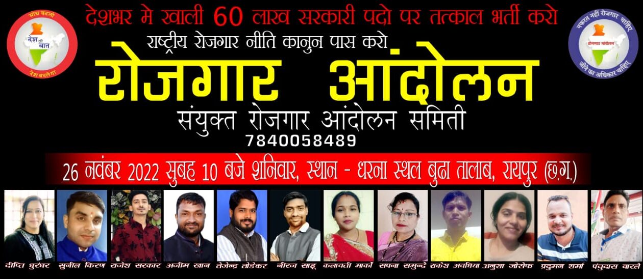 साथियों आज बेरोजगारी तेजी से बढ रही है आप सभी जानते हैं, आज शिक्षित होते हुए भी कई लोग बेरोजगार हैं। बेरोजगारी का मतलब सिर्फ सरकारी नौकरी से नही होता। इसका मतलब हर वो सेक्टर जिसमें रोजगार या कहना चाहिए जिससे सम्मानजनक अपने और परिवार का भरण पोषण किया जा सके ऐसे रोजगार कम हो रहे है। आज देश को एक ऐसी पालिसी की जरूरत है जो बेरोजगारी को खत्म करने के समाधान की तरफ ले जाये। और समाधान है “राष्ट्रीय रोजगार नीति” तो आइऐ सब मिलकर जागरूक हो और समाज और देश के प्रति अपने कर्तव्य को निभाये। संयुक्त रोजगार आंदोलन समिति के बैनर तले देशभर में 60 लाख खाली सरकारी पदों पर तुरंत भर्ती करने एवं राष्ट्रीय रोजगार नीति कानून संसद में पास करने की मांग के साथ 26 नवंबर को देश भर में 500 स्थानों पर रोजगार आंदोलन के तहत एक दिवसीय सामूहिक उपवास का आयोजन हो रहा है.रोजगार आंदोलनः 26 नवंबर 2022 स्थान बूढातालाब रायपुर मे किया जायेगा.राज्यभर में बेरोजगारी का प्रमाण बढ़ते ही जा रहा है कोरोना के कारण यह परिस्थिति और बिकट हो गई हैं काम न होने से सर्वसामान्यों को – परेशानी हो रही है जिससे युवाओं में निराशा है प्रशासन इसे गंभीरता से लें देश में 60 लाख पद रिक्त हैं यह पद जल्द से जल्द भरे जाने की मांग की गई है अन्यथा 26 नवंबर को आंदोलन किया जाएगा जिसमें स्थानीय संगठनो एवं विश्वविद्यालय तथा कॉलेज के युवाओं को भी आमंत्रित किया गया है.शामिल होने का आह्वान किया गया है रोजगार आंदोलन को लेकर 12 लोगो की समिति गठित की गई है जिसमे रायपुर लोकसभा प्रभारी दीप्ति धुरंधर, सुनील किरण, राजेश सरकार, अजीम खान, तेजेन्द तोड़ेकर, अनुषा जोसेफ, प्रदुमन शर्मा, नीरज साहू, कलावती मारको, पंचूदास बारले, सपना समुन्द्रे, राकेश कुमार अवधिया