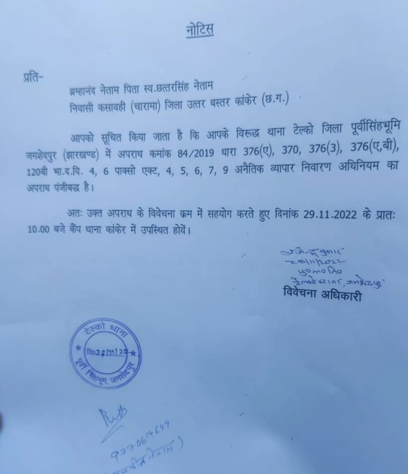 छत्तीसगढ़,भानुप्रतापपुर भाजपा प्रत्याशी ब्रम्हानंद नेताम सहित अन्य आरोपियों को झारखंड पुलिस ने थमाया नोटिस, आज थाने में होना होगा उपस्थित…