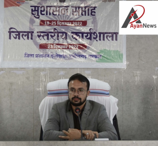 दंतेवाड़ा, 23 दिसंबर 2022। भारत सरकार के निर्देशानुसार जिले में 19 से 25 दिसंबर तक सुशासन सप्ताह- ‘प्रशासन गांव की ओर’ मनाया जा रहा है। इसी क्रम में आज संयुक्त जिला कार्यालय के डंकिनी सभाकक्ष में आज कलेक्टर श्री विनीत नंदनवार की अध्यक्षता में आज 23 दिसंबर को सुशासन सप्ताह अंतर्गत जिला स्तरीय एक दिवसीय विशेष कार्यशाला का आयोजन किया गया। कार्यशाला में विभागों के लंबित प्रकरणों की अद्यतन स्थिति की जानकारी लेकर सभी विभागों को जनशिकायतों के निराकरण में तेजी लाने के निर्देश दिये। कलेक्टर श्री विनीत नन्दनवार ने सुशासन सप्ताह के दौरान जन शिकायतों के समाधान और बेहतर सेवा वितरण के लिए विशेष प्रयास करने को कहा। उन्होंने कहा कि सुशासन सप्ताह के दौरान लंबित लोक शिकायतों का निवारण एवं जन शिकायतों का समाधान किया जा रहा है।