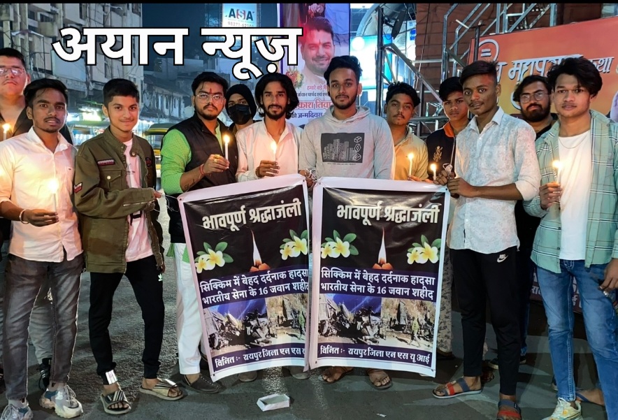 प्रदेश प्रभारी महामंत्री हेमंत पाल के निर्देशानुसार प्रदेश सचिव कुणाल दुबे की उपस्थिति में रजत ठाकुर के नेतृत्व मे सिक्किम में हुए दर्दनाक हादसे में शहीद वीर जवानों को रायपुर जिला एनएसयूआई के साथियो के साथ जयस्थम चौक में श्रद्धांजलि दिया गया