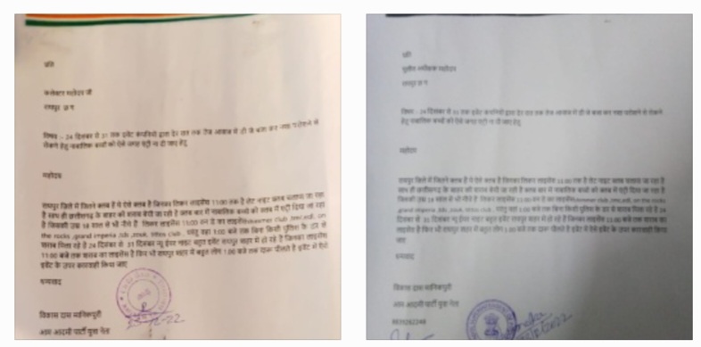 रायपुर विकास दास मानिकपुरी द्वारा मिली जानकारी के अनुसार जिले में जितने क्लब है ये सभी ऐसे क्लब है जिनका लिकर लाइसेंस 11:00 तक है लेट नाइट क्लब चलाया जा रहा है। साथ ही छत्तीसगढ़ के बाहर की शराब बेची जा रही है क्लब बार में नाबालिक बच्चो को क्लब में एंट्री दिया जा रहा है? जिसकी उम्र 18 साल से भी नीचे है वही लिकर लाइसेंस 11.00 बजे रात तक का वन डे का लाइसेंस टी. एम. सी. क्लब द्वारा लेकर रोजाना चलाया जाता है साथ ही 11 बजे के बजाय 1:00 बजे तक बिना किसी पुलिस के डर से शराब पिलाते रहते है 24 दिसंबर से 31 दिसंबर तक न्यू ईयर नाइट के नाम से बहुत से इवेंट रायपुर शहर में हो रहे हैं जिनका लाइसेंस 11:00 बजे तक शराब का लाइसेंस है फिर भी रायपुर शहर में बहुत लोग 1.00 बजे तक दारू पीलते है इवेंट में ऐसे इवेंट के उपर कारवाही किया जाने की मांग विकास दास मानिकपुरी ने एस.पी व कलेक्टर महोदय से लिखित मे शिकायत की है