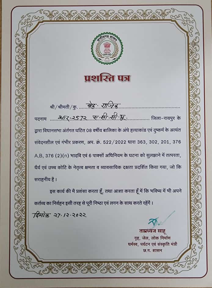 राजिक .आर.25.72 ए.सी.सी.यू. पदनाम …….. जिला र जिला – रायपुर के द्वारा विधानसभा अंर्तगत घटित 08 वर्षीय बालिका के अंधे हत्याकांड एवं दुष्कर्म के अत्यंत संवेदनशील एवं गंभीर प्रकरण, अप. क्रं. 522/2022 धारा 363, 302, 201, 376 A.B, 376 (2) (n) भादवि एवं 6 पाक्सों अधिनियम के घटना को सुलझाने में तत्परता, धैर्य एवं उच्च कोटि के नेतृत्व क्षमता व व्यावसायिक दक्षता प्रदर्शित किया गया, जो कि सराहनीय है।