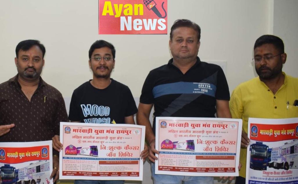 मारवाड़ी युवा मंच रायपुर शाखा द्वारा तीन दिवसीय निशुल्क कैंसर परीक्षण शिविर का भव्य आयोजन शहर के मध्य स्थित टाउन हॉल कलेक्टर परिसर कचहरी चौक रायपुर में 25 से 27 जनवरी 2023 को अखिल भारतीय मारवाड़ी युवा मंच द्वारा संचालित मोबाइल कैंसर स्क्रीनिंग वैन द्वारा आयोजित है।। मारवाड़ी युवा मंच रायपुर शाखा के संस्थापक अध्यक्ष व प्रांतीय संयोजक श्री नरेश कुमार अग्रवाल दिनेश पत्रकार वार्ता में बताया कि आधुनिक तकनीकी मशीनों से सुसज्जित मोबाइल कैंसर स्क्रीनिंग वैन द्वारा और संजीवनी कैंसर हॉस्पिटल परामर्श विशेषज्ञों के प्रथम जांच द्वारा किया जायेगा।। मंच के अध्यक्ष अग्रवाल उपाध्यक्ष राकेश शर्मा ने जानकारी देते हुए बताया कि यह कैंप रायपुर के आम जनमानस सर्व समाज हेतु आयोजित है जिसका लाभ प्रथम स्तर पर कोई भी ले सकता है।। कैंसर एक जानलेवा बीमारी है जिसका पता अक्सर गंभीर स्टेज पर आकर लगता है। इस निशुल्क शिविर में मोबाइल कैंसर स्क्रीनिंग वैन व कुशल डॉक्टर द्वारा परीक्षण किया जायेगा समय रहते एकदम भारी का इलाज किया जा सके। यह तीन दिवसीय निशुल्क कैंसर परीक्षण शिविर में अधिक से अधिक आम लोगों को इसका लाभ मिले यही भावना के साथ मारवाड़ी युवा मंच रायपुर शाखा के सदस्य नरेश अग्रवाल, सुधीर अग्रवाल, राकेश शर्मा, हर्ष अग्रवाल, जयंत अग्रवाल, रविन्द्र अग्रवाल, उत्तम गर्ग ने सर्व समाज और जनप्रतिनिधि को भी सेवार्थ भावना से इस शिविर में आमंत्रित किया है।।