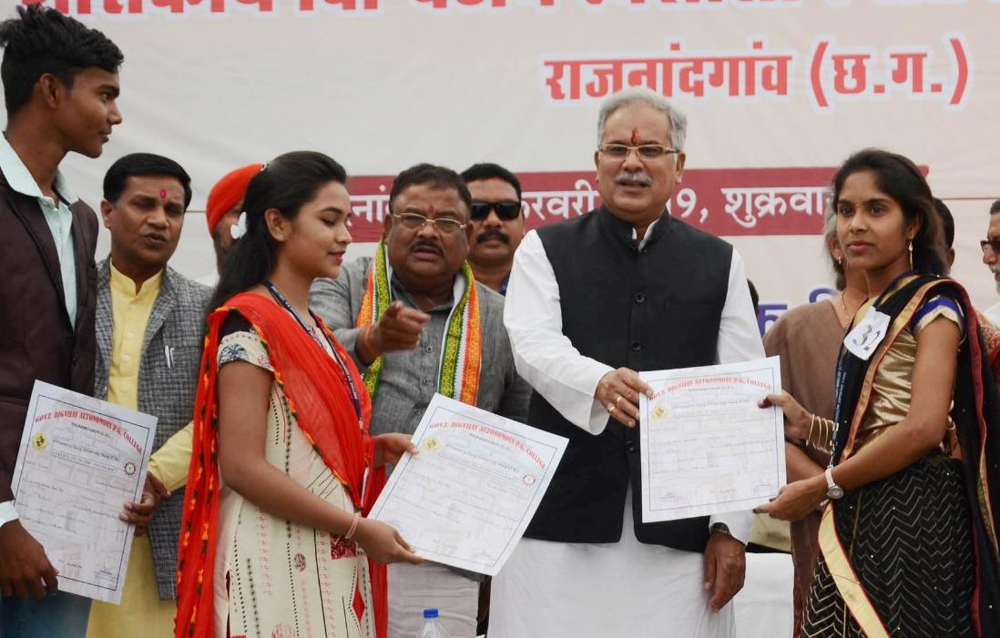 मुख्यमंत्री ने कहा कि उच्च शिक्षा के क्षेत्र में अध्ययन-अध्यापन की व्यवस्था को सुदृढ करने महाविद्यालयों में रिक्त एक हजार 300 से अधिक सहायक प्राध्यापकों के पदों को भरने की कार्रवाई शुरू हो गई है। स्कूलों में भी 15 हजार शिक्षकों की भर्ती की जाएगी। शिक्षित युवाओं के लिए रोजगार के नये अवसर खुल रहे हैं। राज्य में कृषि आधारित औद्योगिक ईकाईयों को भी प्रोत्साहित करने का निर्णय लिया गया है।छत्तीसगढ़ संसाधनों से समृद्ध राज्य है। इन संसाधनों का सुव्यवस्थित उपयोग कर नया छत्तीसगढ़ बनाने प्रदेश सरकार कार्य करेगी। उन्होंने कहा कि विद्यार्थी प्रदेश व देश के भविष्य हैं। युवाओं के मन में सपने भी बहुत होते हैं लेकिन उन्हें ध्यान रखना चाहिए कि इन सपनों को पूरा करते समय उनके पैर जमीन पर रहें। आसमान की ऊचाईयों पर उड़ते समय भी हम अपने संस्कार और आदर्श नहीं भूलें। मुख्यमंत्री ने महाविद्यालय में छात्रावास का निर्माण तत्काल प्रारंभ कराने और ऑडिटोरियम की ध्वनि व्यवस्था को भी दुरूस्त की भी घोषणा की।