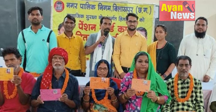 अयान न्यूज मनीष पाल की रिपोर्ट। न्यायधानी मे पेंशन हितग्राहियों को पेंशन कार्ड का वितरण किया गया। नगर निगम बिलासपुर को आर्थिक सामाजिक सुरक्षा पेंशन के अंतर्गत पेंशन हितग्राहियों को पेंशन कार्ड का वितरण महापौर रामशरण यादव एवं सभापति शेख नजीरूद्दीन के द्वारा किया गया। जोन क्र. 06 के अंतर्गत वार्ड क्र. 38 से 70 के पात्र हितग्राहियों को निराश्रित पेंशन कार्ड का वितरण किया गया। गणेश नगर वार्ड क्रमांक 46 के पार्षद इब्राहिम खान अब्दुल के लगातार प्रयास एवं अनुशंसा पर वार्ड के जरूरत मंद हितग्राहियों को भी निराश्रित पेंशन का लाभ दिलाने पेंशन कार्ड बनाकर प्रदाय किया गया। उक्त कार्यक्रम में एमआईसी राजेश शुक्ला एमआईसी मनीष गढ़ेवाल एमआईसी अजय यादव पार्षद परदेसी राज पार्षद लक्ष्मी यादव पार्षद उमेश चंद्र कुमार मोती गंगवानी पार्षद प्रतिनिधि राज बंजारे जिला महासचिव मोहम्मद अयूब किशन टंडन विष्णु तिवारी नगर निगम के अधिकारी कर्मचारियां उपस्थित रहे। निराश्रित पेंशन वार्ड क्र.46 गणेश नगर के लाभान्वित हितग्राहियां
