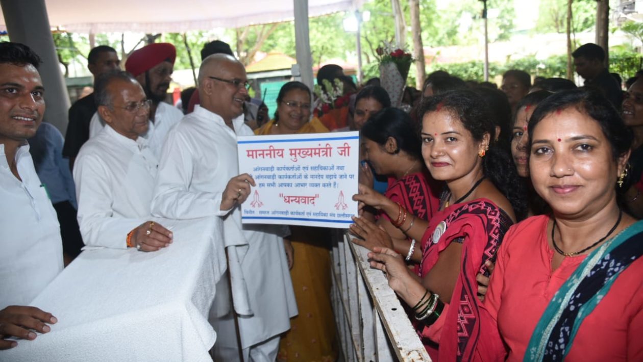 रायपुर 24 जुलाई 2019/ रायपुर जिले की आंगनबॉडी कार्यकर्ताओ और सहायिकाओं ने मुख्यमंत्री श्री भूपेश बघेल को हरेली और तीज के लिए अवकाश देने पर आभार व्यक्त किया। जन चौपाल भेट मुलाकात कार्यक्रम में मुख्यमंत्री निवास में इन कार्यकर्ताओं ने मुख्यमंत्री को छत्तीसगढ़ी व्यंजन का थाल भेंट किया। इस अवसर पर महिला एवं बाल विकास मंत्री श्रीमती अनिला भेड़िया, गृह मंत्री श्री ताम्रध्वज साहू , विधायक श्री कुलदीप जुनेजा भी उपस्थित थे।