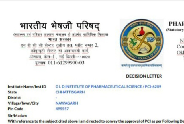 और जांजगीर चांपा के नवागढ़ खरताल के एक मात्र जी एल डी फार्मेसी कॉलेज को मिला पीसीआई से मान्यता*Admission in D Pharma*. अगर आप D Pharma कोर्स में एडमिशन लेने चाहते हैं तो फिजिक्स, केमिस्ट्री और मैथ्स या बायोलॉजी विषयों के साथ 12वीं की परीक्षा पास करने के बाद डीफॉर्म (Diploma in pharmecy) में एडमिशन ले सकते हैं। ये दो बर्ष का डिप्लोमा कोर्स होता है।