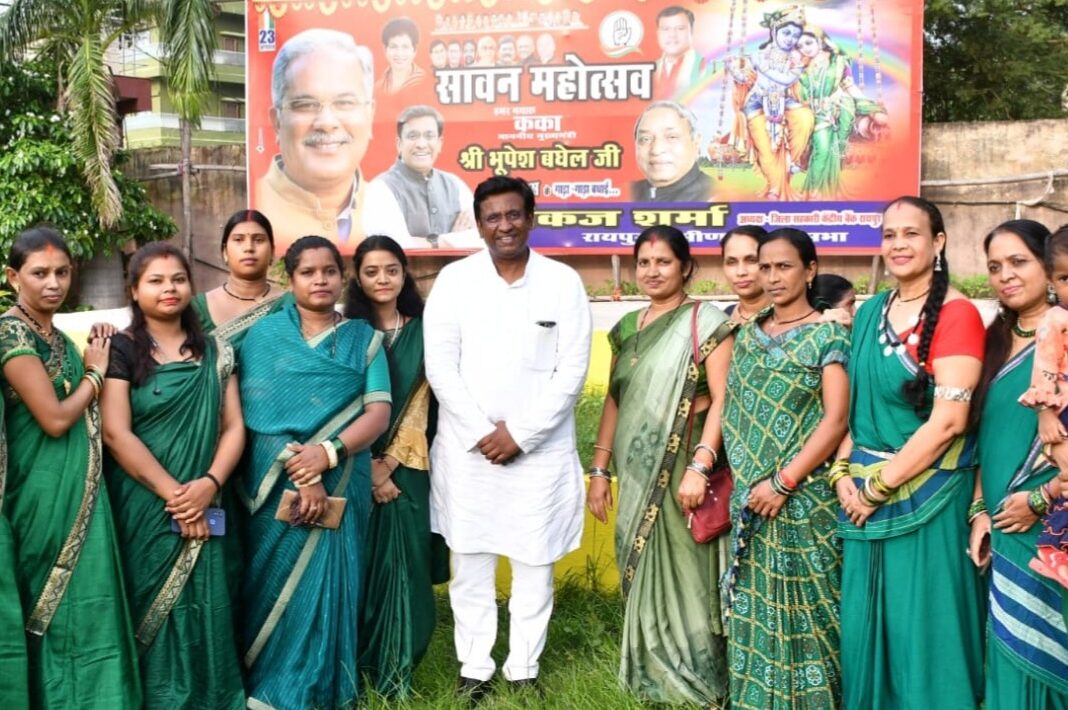 *जिला सहकारी बैंक के अध्यक्ष पंकज शर्मा विशेष रूप से रहे मौजूद*रायपुर—मुख्यमंत्री के जन्मदिवस के अवसर पर रायपुर ग्रामीण विधानसभा क्षेत्र के अंतर्गत सेजबहार स्थित शिवम पैलेस में सावन महोत्सव कार्यक्रम का आयोजन जिला सहकारी बैंक के अध्यक्ष पंकज शर्मा के नेतृत्व में किया गया इस कार्यक्रम में लगभग 600 महिलाएं जुटी हुई थी जिन्होंने मुख्यमंत्री का जन्मदिन बड़े धूमधाम से केक काटकर मनाया। आपको बता दे कि ग्रामीण विधानसभा के अंतर्गत मुख्यमंत्री के जन्मदिवस के अवसर पर विभिन्न कार्यक्रमों का आयोजन किया गया था और विभिन्न स्थानों पर केक काटे गए सावन महोत्सव का कार्यक्रम में महिलाओं ने बढ़ चढ़कर हिस्सा लिया। महिलाओं ने विभिन्न खेलों में भी भाग लिया और खूब आनंदित नजर आई कार्यक्रम में पहुंची महिलाओं को जिला सहकारी बैंक के अध्यक्ष पंकज शर्मा द्वारा मोमेंटो देकर सम्मानित भी किया गया। श्री पंकज शर्मा ने कहा कि छत्तीसगढ़ का नाम पूरी दुनिया में रोशन करने वाले ऐसे मुख्यमंत्री श्री भूपेश बघेल का जन्मदिन बड़े ही धूमधाम से मनाया गया श्री भूपेश बघेल के नेतृत्व में छत्तीसगढ़ में लगातार स्वास्थ्य ,शिक्षा के साथ किसानों से लेकर युवाओं तक के लिए काम किया जा रहे हैं जिससे पूरे छत्तीसगढ़ में खुशी का माहौल बना हुआ है छत्तीसगढ़ की संस्कृति के साथ-साथ तीज त्यौहार को भी मुख्यमंत्री द्वारा सहेजा जा रहा है।