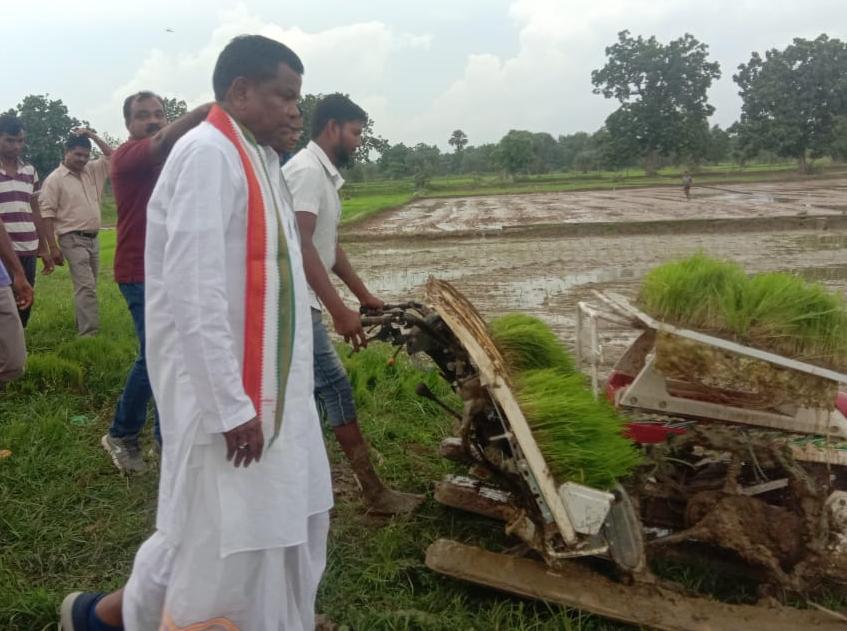धान रोपाई का आधुनिक तौर तरीका देखने पहुंचे उद्योग मंत्री लखमा