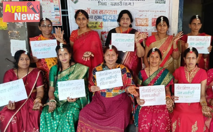 इस अवसर पर विंध्यवासिनी स्कूल की संचालिका श्रीमती यशोदा सोनकर, श्रीमती जानकी गुप्ता, श्रीमती प्रभा श्रीवास्तव द्वारा महिला मतदाताओं को प्रोत्साहित करने के लिए विभिन्न गतिविधियां आयोजित की गईं। जिसमें महिलाओ ने लाल साड़ी में फूलो से श्रृंगार कर मतदाता जागरूकता का संदेश मेहंदी लगाकर दिया। साथ ही स्वीप नोडल अधिकारी श्रीमती यादव ने ’जम्मो तिजहारिन मतदान करिही ए दारी’ के संबंध में तिजहारिन महिलाओं को अपील की है।