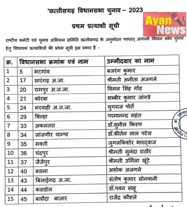 रायपुर/ 13/10/2023/ जनता कांग्रेस पार्टी छत्तीसगढ़ के प्रदेश अध्यक्ष श्री संतोष सोनवानी ने आज राष्ट्रीय अध्यक्ष डा महताब रॉय एवं राष्ट्रीय महासचिव श्री अमित वर्मा और प्रदेश चुनाव अभियान समिति के अनुमोदन पश्चात छत्तीसगढ़ में आगामी 2023 विधानसभा चुनाव हेतु 32 विधायक प्रत्याशियों की प्रथम सूची जारी की। जिसमे भटगांव से बजरंग कुमार, सारंगढ़ से अनिता अजगले,रामपुर से विमल सिंह गोंड,कोरबा से शब्बीर कुमार जांगड़े,मरवाही से युगराज पोर्ते,बिल्हा से परमानंद महंत,अकलतरा से डॉ सुनील किरण, जांजगीर चांपा से डॉ कीर्तन लाल पटेल,शक्ति से जुगलकिशोर भारद्वाज,चंद्रपुर से श्रीमती सुनंदा राठौर,जैजैपुर से श्रीमती उर्मिला खूंटे, बसना से अशोक अजगले,बिलाईगढ़ से संतोष सोनवानी,कसडोल से डॉ पवन साहू, बलौदा बाजार से राजेंद्र कौसले,भाटापारा से अमरदास मातरे,धारसीवा से श्रीमती लछमिता खूंटे,रायपुर शहर पश्चिम से विकास कुमार सदाफल,अभनपुर से भीषम कुमार कुर्रे,राजिम से गुलशन अजगर, संजारी बालोद खोमेश्वर ठाकुर, डौंडी लोहारा से भुवन लाल गोंड,गुण्डरदेही से योगेंद्र कुमार उके,पाटन से शंकर प्रसाद यूके,दुर्ग ग्रामीण से निशा कुमारी साहू,दुर्ग शहर से सैफिया कुरैशी,भिलाई नगर से मधुमिता नियाल,वैशाली नगर से गौतम कुमार,अहिवारा से राखी सोनवानी, साजा से अमृत लाल देशलहरे,राजनांदगांव से दिनेश नामदेव और जगदलपुर से ईश्वर भारद्वाज को पार्टी का अधिकृत प्रत्याशी घोषित कर दिया गया है। सोनवानी ने बताया कि लगभग सभी 90 सीटों पर जनता कांग्रेस पार्टी अपने उम्मीदवार खड़े करने जा रही है। सभी वर्गों को ध्यान में रखकर प्राथमिकता के संकल्प के साथ भय भूख और भ्रष्टाचार मिटाने का नारा लिए जनता कांग्रेस इस बार बड़ा उलटफेर करने के मूड में स्पष्ट दिखाई दे रही है।