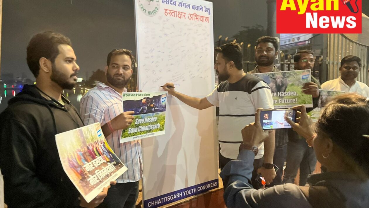 छत्तीसगढ़ प्रदेश युवा कांग्रेस के प्रदेश सचिव अभिषेक कसार के नेतृत्व में हसदेव वनक्षेत्र में जंगलों की अंधाधुंध कटाई के विरोध में छत्तीसगढ़ प्रदेश युवा कांग्रेस द्वारा तेलीबांधा तालाब रायपुर में हस्ताक्षर अभियान चलाया गया