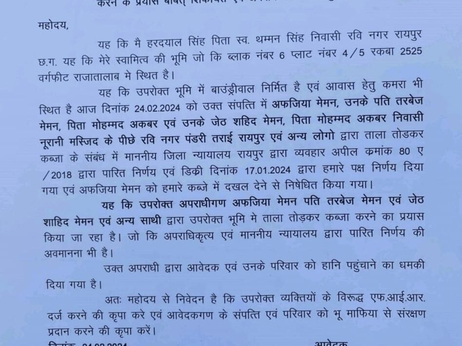 रायपुर। राजधानी रायपुर के रवि नगर निवासी हरदयाल सिंह ने थाना प्रभारी सिविल लाइन्स को एक लिखित शिकायत कर कांग्रेस नेता आसिफ मेमन के भाई तबरेज़ मेमन और उनकी पत्नी अफज़िया मेमन और जेठ शाहीद मेमन निवासी रवि नगर राजा तालाब एवं अन्य पर एफआईआर दर्ज करने की मांग की है। मगर सवाल इस बात का है कि सत्ता परिवर्तन के बाद भी कांग्रेसी नेताओं और उनके रिश्तेदारों पर पुलिस प्रशासन कार्यवाही करने से क्यों बचना चाह रही है। इस बात को लेकर चर्चा होना स्वाभाविक है।बहरहाल पीड़ित हरदयाल सिंह ने बताया कि उनकी राजा तालाब स्थित जमीन पर मेमन परिवार के तबरेज़ उनकी पत्नी अफज़िया और शाहिद मेमन निवासी रवि नगर राजा तालाब कुछ अन्य युवको के साथ मेरे जगह पर आकर मेरे द्वारा लगाए गए ताले को तोड़कर जबरिया मेरी जमीन पर कब्ज़ा करना चाहते है। मुझे और मेरे परिवार को हानि पहुंचाने की धमकी देते है। जिसकी शिकायत मैंने पुलिस से की है और मेमन परिवार के इन सदस्यों पर एफआईआर करने की मांग की है। ज्ञात हो कि कांग्रेस नेता आसिफ मेमन को भी न्यायालय ने एक जमीन में मामले में फरार घोषित किया हुआ है और पुलिस उसकी तलाश कर रही है।कांग्रेस नेता आसिफ मेमन अपने राजनीतिक रसूख के कारण पुलिस की पकड़ से बाहर है और कांग्रेस नेता आसिफ मेमन के भाई शाहिद मेमन पर पूर्व में एक जमीन संबंधित मामले में 420 के तहत पुलिस में मामला दर्ज है। अब यह उनके भाइयों के ख़िलाफ़ एक और ज़मीन कब्ज़ा की शिकायत पर पुलिस का रवैया देखने वाला होगा।