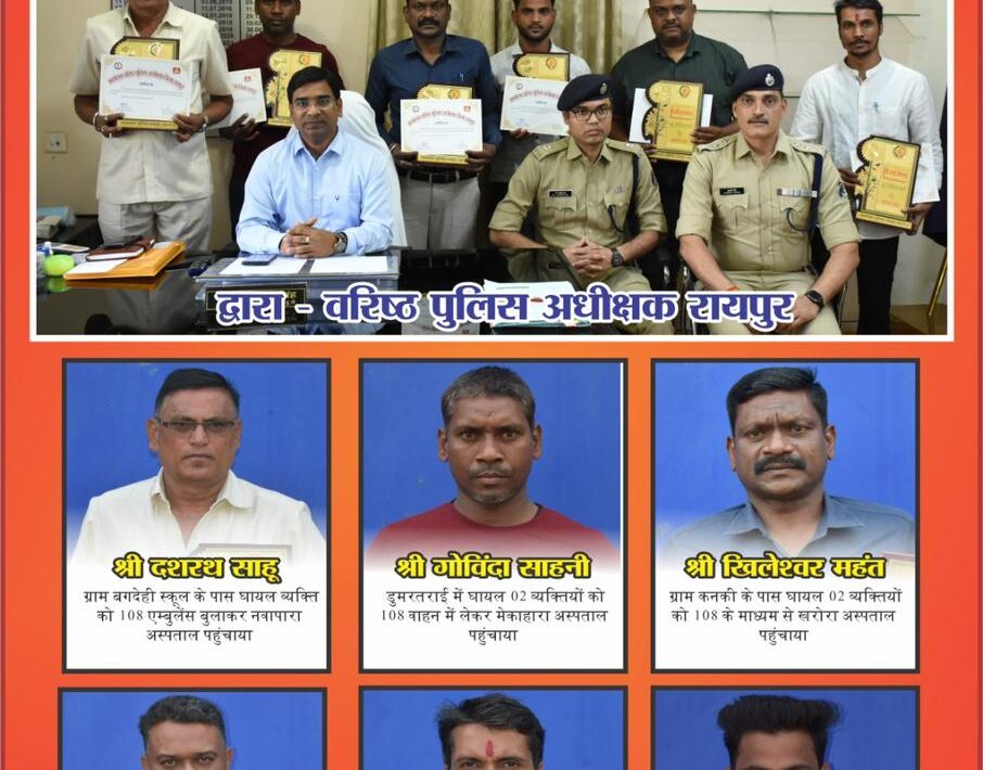 बता दें कि भारत देश में प्रति वर्ष सड़क दुर्घटना में लगभग डेढ़ लाख लोगो की मृत्यु होती है, जिसका प्रमुख कारण घायलों को त्वरित चिकित्सा व्यवस्था उपलब्ध नही होने के कारण होता है। सड़क दुर्घटना के दौरान 30 मिनट का समय गोल्डन आवर कहलाता है इस दौरान यदि घायल व्यक्ति को किसी भी प्रकार से हास्पिटल तक पहुंचा दिया जाता है या फिर चिकित्सा व्यवस्था उपलब्ध करा दिया जाता है तो घायल की जान बचाई जा सकती है। किन्तु अधिकांश सड़क दुर्घटनों में लोगों द्वारा बार बार पेशी जाना पड़ेगा व पुलिस द्वारा बार बार पूछताछ के लिए आना पडे़गा परेशानी होगी सोचकर मोबाइल फोन से विडियों फोटो बना लिया जाता है किन्तु घायल की जान बचाने हेतु कोई उपाय नही किया जाता जिससे घायल व्यक्ति त्वरित उपचार के अभाव में तड़प-तड़प कर दम तोड़ देता है। जिसे दृष्टिगत रखते हुए वरिष्ठ पुलिस अधीक्षक जिला रायुपर श्री संतोष कुमार सिंह द्वारा सभी थाना प्रभारियों को निर्देशित किया है कि थाना क्षेत्र में घटित सड़क दुर्घटना में घायल को त्वरित सहायता पहुंचाने हेतु गुड सेमेरिटंस का अधिक से अधिक प्रचार-प्रसार करने एवं घायल को त्वरित सहायता पहुंचाकर जान बचाने वाले गुड सेमेरिटंस को प्रोत्साहित व पुरस्कृत करने हेतु उपस्थित कराने निर्देशित किया गया है। इसी क्रम में आज दिनांक को रायपुर जिले में घटित विभिन्न सड़क दुर्घटनाओं में घायलों की मदद करने वाले गुड सेमेरिटंस को वरिष्ठ पुलिस अधीक्षक जिला रायपुर श्री संतोष कुमार सिंह द्वारा मोंमेंटो व प्रशस्ति पत्र देकर सम्मानित किया गया साथ ही इनका फोटो बड़े-बड़े होर्डिंग में लगाने निर्देशित किया गया। सड़क दुर्घटना में घायलों की मदद करने वाले गुड सेमेरिटंस निम्नानुसार है:-
