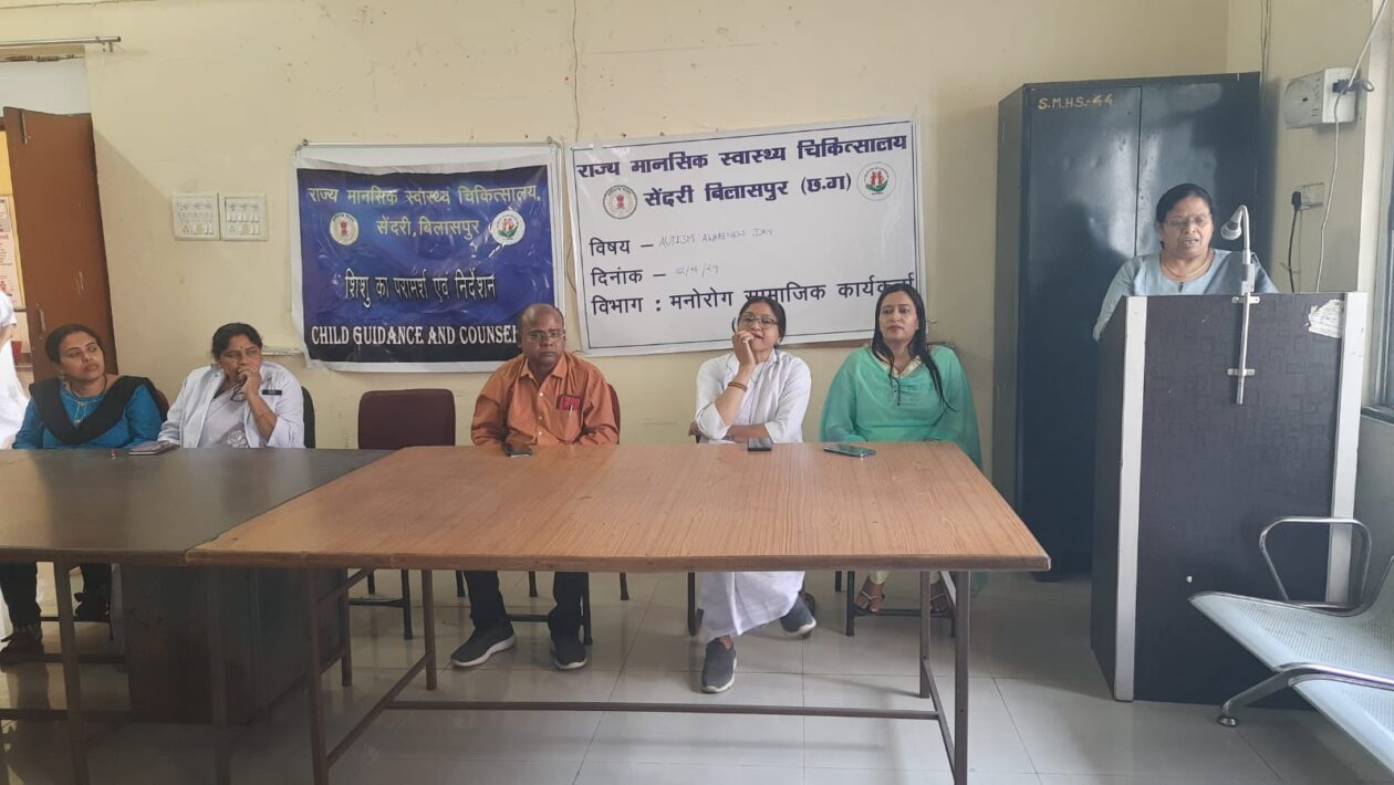 राज्य मानसिक चिकित्सालय सेंदरी बिलासपुर छ.ग के मनोरोग सामाजिक कार्यकर्ता विभाग के व्दारा मनोरंजन रुम मे विश्व आटिज्म जागरूकता दिवस मनाया गया। इस मौके पर अस्पताल अधीक्षक डाॅ प्रभु चौधरी के व्दारा आटिज्म पीड़ित बच्चो के लिए बेहतर स्वास्थ्य सुविधाऐ उपलब्ध कराने की बात कही गयी और भविष्य मे बड़े स्तर पर कार्यक्रम करवाने की बात रखी गयी। डाॅ अल्का अग्रवाल के व्दारा आटिज्म पीड़ित मरीजो के लक्षण, कारण, निदान एवं रोकथाम के बारे मे जानकारी दी गयी। जरीना सिद्दीकी के व्दारा आटिज्म पीड़ित बच्चो को दी जाने वाली सरकारी योजनाओ के बारे मे जानकारी दी गयी। नर्सिंग अधीक्षक वानी खटकर सिस्टर ने कहा कि आटिज्म पीड़ित बच्चो को थैरेपी के माध्यम से चिकित्सा दी जा सकती है। नर्सिंग मैट्रन खेलकला माण्ड्रे सिस्टर ने चिकित्सालय मे उपलब्ध सुविधाओ के बारे मे जानकारी दी। कार्यक्रम मे उपस्थित चिकित्सालय के सभी अधिकारी कर्मचारी, नर्सिंग छात्र छात्राओ और परीजनो का धन्यवाद ज्ञापन किया गया। मंच संचालन डाॅ दीप्ति (धुरंधर) श्योकंद के व्दारा किया गया।