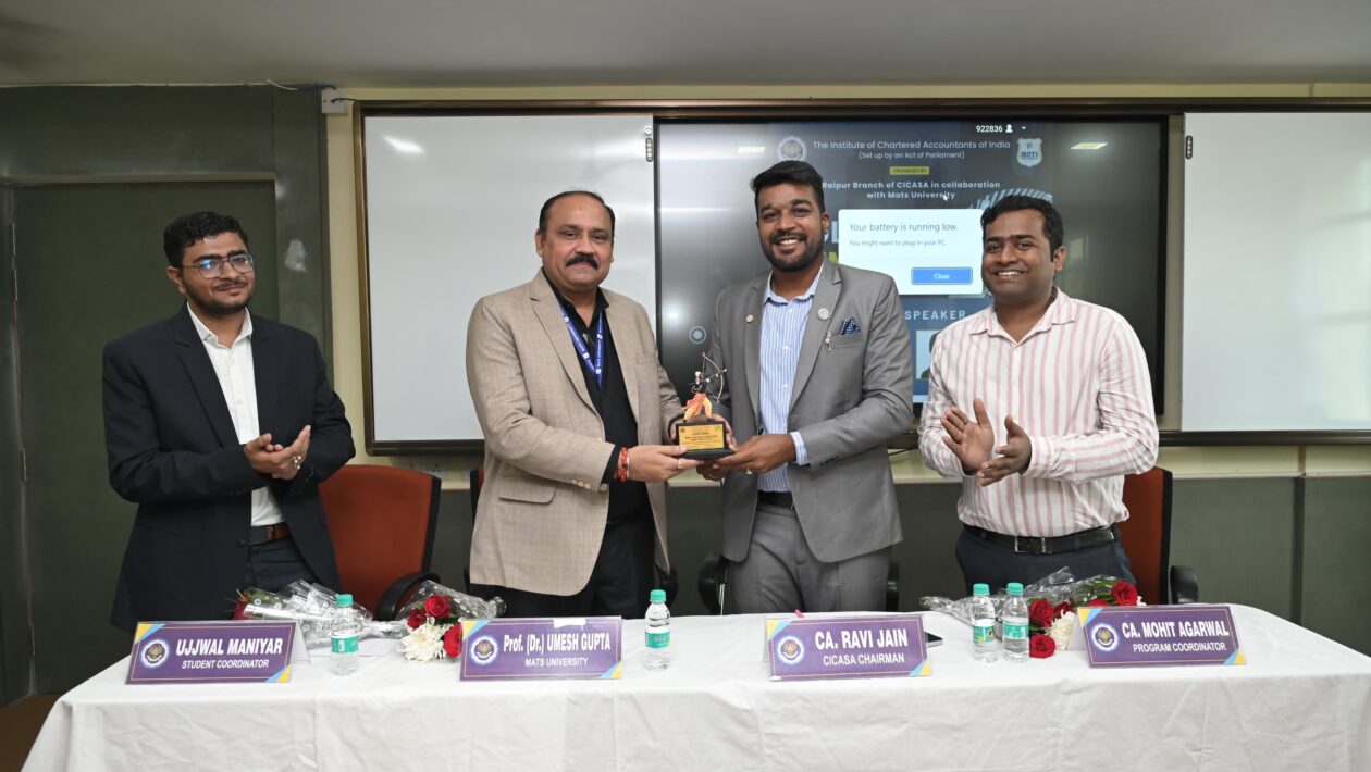 रायपुर आईसीएआई (Cआईसीएएसए) और मेट्स यूनिवर्सिटी के संयुक्त तत्वावधान में “आर्टिफिशियल इंटेलिजेंस, क्रिप्टोक्यूरेंसी, स्टॉक मार्केट निवेश और चार्टर्ड अकाउंटेंट्स के विभिन्न क्षेत्रों में संभावनाएं” विषय पर कार्यक्रम मेट्स यूनिवर्सिटी के ऑडिटोरियम, पंडरी में आयोजित किया गया, जिसमें यूनिवर्सिटी और सीए के 150 से अधिक छात्रों ने भाग लिया।
