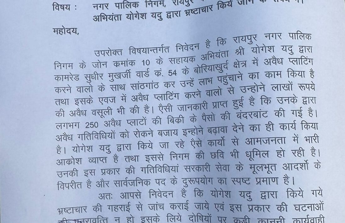 नगर निगम जोन 10 में पदस्थ अभियंता के खिलाफ कलेक्टर से शिकायत,,,,,