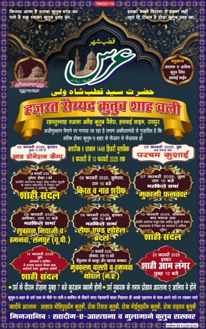 *5 फरवरी को परचम कुशाई, शाम 5 बजे.*रायपुर। चिराग़ वाले बाबा के नाम से मशहूर क़ुतुब ए शहर हज़रत सैय्यद क़ुतुब शाह वली रदी अल्लाहु अन्हो, हलवाई लाइन, रायपुर छत्तीसगढ़ का उर्स पाक 6 फरवरी से 10 फरवरी 2025 तक मनाया जाएगा। खादिमे आस्ताना शेख़ रियाज़ क़ुतुबी (रिज्जु), हाजी मोहियुद्दीन क़ुतुबी (सोनू), शेख़ मोइनुद्दीन क़ुतुबी (मोनू), शेख़ सद्दाम क़ुतुबी ने बताया कि उर्स शरीफ की तमाम तैयारिया पुरी कर ली गई है। सभी मोहल्ले के युवा स्वमेव जुड़कर प्रयासरत है कि उर्स में आने वाले श्रद्धालुओं को किसी भी प्रकार की कोई परेशानी न हो। दरगाह कमेटी के नोमान अकरम हामिद अशरफी ने क़ुतुब सरकार के चाहने वालों से अपील की है कि बारगाहे हुजूर क़ुतुब ए शहर में अदब व एहतराम और शरीअत के दायरे में रहकर संदल और चादर पेश करें और हज़रत के फ्यूज़ों बरकात से मालामाल हों। डी जे, धमाल, और आतिशबाजी का इस्तेमाल हरगिज़ हरगिज़ न करें, चादर प्रशासन से अनुमति मिलने के बाद ही निकालें। 2 फरवरी इतवार सुबह 10 बजे से शाम 4 बजे तक रक्तदान शिविर का आयोजन किया गया जिसमें 55 रक्तदाताओं ने हिस्सा लिया। 5 फरवरी शाम 5 बजे परचम कुशाई होंगी। 6 फरवरी 2025 जुमेरात बाद नमाज़े असर शाही संदल व चादर ख़ादिमे आस्ताना मरहूम अब्दुल मजीद क़ुतुबी के मकान छोटापारा से निकलकर आस्ताना ए अक़दस पहुँचकर चादरपोशी के बाद आलमे इंसानियत के लिए दुआ होगी6 फरवरी 2025 जुमेरात रात 10 बजे किरत व नात शरीफ़ का प्रोग्राम7 फरवरी 2025 जुमा रात 10 बजे मुक़ामी क़व्वाल की महफ़िल ए समां8 फरवरी 2025 सनीचर रात 10 बजे महफ़िल ए समां होगी जिसमें हिंदुस्तान के मशहूर वो मारुफ सूफ़ी कव्वाल सुब्हान नियाज़ी ( रामपुर ) कलाम पेश करेंगे।9 फरवरी 2025 इतवार, रात 10 बजे 36 गढ़ का नाम पूरे भारत में रौशन करने वाले सिंगर सैफ एन्ड सोहैल ब्रदर्स (बैरन बाज़ार, रायपुर) की सूफियाना क़व्वाली होगी।10 फरवरी 2025 पीर बाद नमाज़े असर शाही संदल व चादर ख़ादिमे आस्ताना मरहूम अब्दुल अज़ीज़ क़ुतुबी के मकान राजातालाब से निकलकर आस्ताना ए अक़दस पहुँचेगा, चादरपोशी के बाद खुसूसी दुआ होगी।10 फरवरी 2025 पीर, रात 10 बजे महफिल ए समां में हिंदुस्तान के मशहूर वो मारुफ इंटरनेशनल कव्वाल मुकर्रम वारसी ( भोपाल ) की क़व्वाली के साथ उर्स संपन्न होगा।12 फरवरी 2025 बुध बाद नमाज़े मग़रिब, संदल व चादर हज़रत सैय्यद बाबा, कर्मचारी भवन, बूढ़ापारा जाएगी23 फरवरी 2025 इतवार सुबह 10 बजे शाही आम लंगर व दस्तारबंदी की जाएगी।