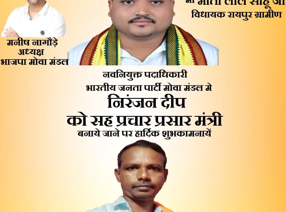 भाजपा मोवा मंडल का गठन मनीष नागौड़े अध्यक्ष भाजपा मोवा मंडल /नवनियुक्त पदाधिकारी भारतीय जनता पार्टी मोवा मंडल मे निरंजन दीप को सह प्रचार प्रसार मंत्री बनाया गया वही दीपक हरपाल को कार्यकारिणी सदस्य बनाये जाने पर सड्डू के आम जनता मे खुशी की लहर दौड़ गई दीपक हरपाल विगत कई वर्षों से पार्टी के लिए निरंतर निस्वार्थ भावना कार्य कर रहे थे साथ आम जनता के बिच उनकी छबि मिलनसार व्यक्तित्व के धनी होने के कारण बहोत ही अच्छी है वफादारी, ईमानदारी, समझदारी, जिम्मेदारी सब कुछ उनके अंदर प्रचूर मात्रा मे है सभी समाज के लिए गौरव है बेदाग छवि, ईमानदारी, निष्पक्षता, जिम्मेदारी, वफादारी, कामकाज के प्रति तत्परता के साथ आम लोगों के राजकीय कामकाज के प्रति बिना किसी विवाद के निष्पक्ष त्वरित निस्तारण इनकी पहचान सदैव रहा है। इनकी उत्कृष्ठ कार्यशैली ओर कर्तव्यनिष्ठा के चलते आज दीपक हरपाल को मोवा मंडल मे कार्यकारिणी सदस्य बनाया गया है