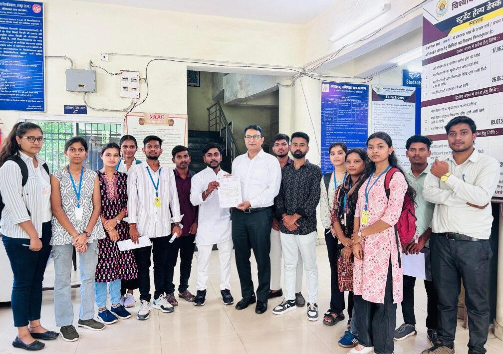 पंडित रविशंकर शुक्ल यूनिवर्सिटी रायपुर में आज दिनाँक 04/06/2025 कों सत्यनारायण अग्रवाल शा. महाविद्यालय कोहका कें (परीक्षा केंद्र क्रमांक 117 ) में B.sc द्वितीय वर्ष कें महाविद्यालयीन परीक्षार्थियों कें परीक्षा परिणाम रसायन विज्ञान (chemistry) में लगभग सैकड़ो छात्र का रिज़ल्ट बहुत ख़राब आया हैं। सैकडो कें संख्या में एक हीं क्लास के स्टूडेंट्स एक हीं सब्जेक्ट में फैल होना पंडित रविशंकर शुक्ल यूनिवर्सिटी कें परीक्षा विभाग कीं लापरवाही हैं कोहका महाविद्यालय के छात्र – छात्राओ का शिकायत मिलते हीं प्रदेश उपाध्यक्ष एनएसयूआई अमित शर्मा कें आदेशानुसार व प्रदेश महासचिव एनएसयूआई निखिल वंजारी के निर्देशानुसार सूर्यप्रताप बंजारे ज़िला उपाध्यक्ष रायपुर ज़िला ग्रामीण एनएसयूआई के नेतृत्व में ज्ञापन सौपा गया ।