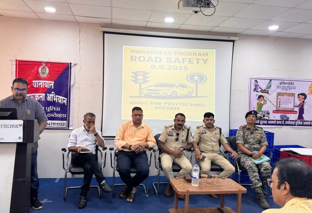🔷 *श्रीमान पुलिस अधीक्षक दन्तेवाड़ा श्री गौरव राय (भा.पु.से.) के निर्देशन* में यातायात व महिला सेल टीम एनएमडीसी डीएवी पॉलिटेक्निक कॉलेज जावांगा पहुंच कर कल दिनांक 8 सितंबर 2025 को सड़क सुरक्षा जागरूकता पर कार्यशाला का आयोजन किया गया, जिसमें दंतेवाड़ा जिला के यातायात प्रभारी प्रहलाद कुमार साहू, सहायक उप निरीक्षक जितेंद्र त्रिपाठी एवं महिला सेल प्रभारी आशा सिंह प्रवक्ता के रूप में उपस्थित हुए। संस्थान के प्राचार्य डॉ मुकेश ठाकुर द्वारा उपस्थित अतिथियों का स्वागत किया गया तत्पश्चात कार्यक्रम को आगे बढ़ते हुए यातायात प्रभारी श्री प्रहलाद कुमार साहू जी द्वारा यातायात नियमों एवं सड़क सुरक्षा से संबंधित विषयों के संबंध में छात्र-छात्राओं और शिक्षकगणों को जानकारी दी गई। तत्पश्चात यातायात नियमों एवं उनके पालन से संबंधित विषयों पर चर्चा करते हुए छात्र-छात्राओं को शपथ भी दिलाई गई। साथ ही यातायात टीम द्वारा राहगीर योजना के संबंध में जानकारी साझा कि गई जिसमें यह बताया गया कि यदि सड़क पर कोई दुर्घटना हो जाती है तो पुलिस की पेपर वर्क से बिना डरे उनकी सहायता की जानी चाहिए क्योकि इसके तहत सहयोग करने वाले का नाम गोपनीय रखी जायेगी और राहगीर योजना के तहत पुरुस्कृत भी किया जाएगा । इसके पश्चात आशा सिंह द्वारा साइबर सुरक्षा एवं ऑनलाइन होने वाले धोखाधड़ी एवं नुकसान के विषयों पर चर्चा करते हुए छात्र-छात्राओं को इस संबंध में जागरूक किया गया। साथ ही अभिव्यक्ति एप की जानकारी दी जाकर एप इंस्टाल कराया गया जो की किसी अप्रिय परिस्थिति में सहायता हेतु उपयुक्त है। उक्त कार्यशाला में संस्थान के छात्र-छात्राएं, शिक्षक गण व अन्य कर्मचारी भी उपस्थित थे। अंत में संस्था के प्राचार्य डॉ मुकेश ठाकुर द्वारा उपस्थित अतिथियों द्वारा कार्यशाला के सफल संचालन के लिए धन्यवाद ज्ञापन प्रेषित किया गया।
