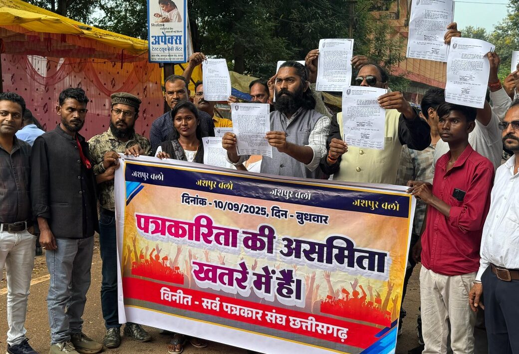 जशपुर।मुख्यमंत्री के गृह ज़िले जशपुर में पत्रकारों पर नोटिस थोपने और मानहानि का मुकदमा दर्ज कराने की धमकी के विरोध में जिलेभर के पत्रकार संगठनों ने शुक्रवार को ज़िला कलेक्टर कार्यालय पहुंचकर जोरदार विरोध दर्ज कराया। इस दौरान उन्होंने कलेक्टर के माध्यम से मुख्यमंत्री को एक ज्ञापन सौंपा, जिसमें जनसंपर्क विभाग की सहायक संचालक नूतन सिदार के खिलाफ कठोर कार्रवाई की मांग की गई है।