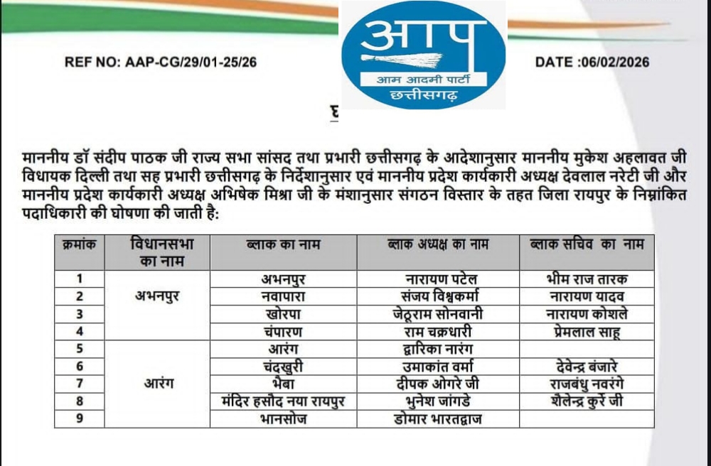 दिनांक 09/02/26विधान सभा आरंग में आम आदमी पार्टी ने ब्लॉक अध्यक्षों की नियुक्ति। आरंग:- आम आदमी पार्टी देश के राष्ट्रीय पार्टी होने के बाद से पूरे देश में सभी राज्यो में पार्टी संगठन खड़ा करने में जुट गई है। राष्ट्रीय संयोजक अरविंद केजरीवाल के ऐलान के बाद से पूरे देश में आम आदमी पार्टी संगठन के विस्तार को लेकर मजबूती से काम कर रही है। सभी स्तर के चुनाव लड़ने की ऐलान के बाद से छत्तीसगढ़ में भी संगठन सृजन को लेकर पार्टी काफ़ी गंभीर है। पार्टी वार्ड से लेकर विधान सभा स्तर तक पदाधिकारी की नियुक्ति के लिए प्रयास कर रही है। ताकि मजबूत संगठन खड़ा होने पर जनता के अधिकारो के लिए लड़ाई लड़ सके। हमारे प्रदेश में तीन साल चुनाव का समय बाकी है। लेकिन पार्टी अभी से छत्तीसगढ़ में चुनावी तैयारी में जुट गई हैं। आम आदमी पार्टी आगामी विधान सभा चुनाव 2028 -29 के लिए मजबूत संगठन के साथ मजबूती से चुनाव लड़ छत्तीसगढ़ में सरकार बनाने के लिए संकल्प रत है। जनता के बीच विकल्प के रूप में पार्टी खड़ा करने के लिए संगठन जी जान से जुट गए है। जिसको लेकर आम आदमी पार्टी पूरे प्रदेश में छत्तीसगढ़ बचाबो यात्रा की शंखनाद भी प्रारंभ कर दी है। विधान सभा आरंग को 7 ब्लाकों मे बाटा गया है। जिसमें 1 आरंग से द्वारिका नारंग को ब्लॉक अध्यक्ष 2- मंदिर हसौद नया रायपुर ब्लॉक भुनेश जांगड़े को ब्लॉक अध्यक्ष सचिव शैलेन्द्र कुर्रे 3 – चंदखुरी ब्लॉक अध्यक्ष उमाकांत वर्मा सचिव देवेंद्र बंजारे 4 भानसोज ब्लॉक डोमार भारद्वाज 5 – भैशा ब्लाक दीपक ओगरे ब्लाक अध्यक्ष राजबंधु नवरंगे सचिव के रूप में नियुक्ति किया है। बाक़ी विधानसभा अध्यक्ष सहित सर्कल कमेटी की भी नियुक्ति आदेश जारी होने की जानकारी मिली है। विधान सभा आरंग के संगठन विस्तार को लेकर कार्यकर्ताओं में काफ़ी उत्साह है। आम आदमी पार्टी के नेता परमानंद जांगड़े डागेश्वर भारती छन्नू लाल डहरिया प्रकाश बांधे खेलावन निषाद राजू कुर्रे ने नव नियुक्त पदाधिकारियों को बधाई देते हुए प्रदेश प्रभारी संदीप पाठक सह प्रभारी मुकेश अहलावत कार्यकारी प्रदेश अध्यक्ष उत्तम जायसवाल सहित प्रदेश कमेठी के प्रति आभार व्यक्त किया।