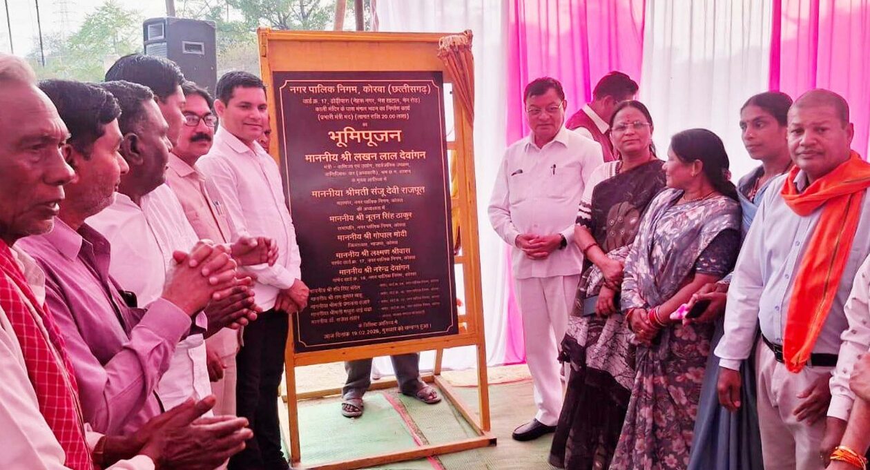 रायपुर: प्रदेश के वाणिज्य, उद्योग एवं श्रममंत्री श्री लखनलाल देवांगन ने आज नगर पालिक निगम कोरबा के वार्ड क्र. 17 में मंगल भवन एवं 19 में सामुदायिक भवन एवं दादरखुर्द बस्ती के सड़क डामरीकरण कार्य का भूमिपूजन किया। वहीं वार्ड क्र. 19 मंे बनने जा रहे सामुदायिक भवन निर्माण कार्य का शुभारंभ नारियल तोड़कर किया। इस मौके पर महापौर श्रीमती संजू देवी राजपूत, सभापति श्री नूतन सिंह ठाकुर, पार्षद श्री नरेन्द्र देवांगन सहित वार्ड के पार्षदगण, जनप्रतिनिधिगण विशिष्ट अतिथि के रूप में उपस्थित थे।