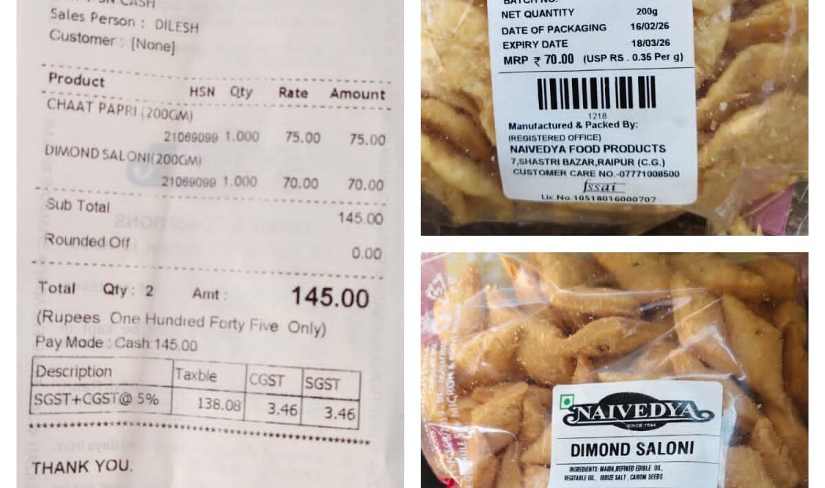 शिकायत के अनुसार दिनांक 18 फरवरी 2026 को शिकायतकर्ता ने दुकान से 200 -200 ग्राम के दो पैकेट — चाट पापड़ी एवं डायमंड सलोनी खरीदे। दोनों उत्पादों पर अंकित अधिकतम खुदरा मूल्य (MRP) 70-70 रुपये था, इस प्रकार कुल राशि 140 रुपये बनती थी, जबकि दुकान द्वारा 145 रुपये का बिल जारी कर 5 रुपये अतिरिक्त वसूले गए। ग्राहक द्वारा आपत्ति करने पर दुकानदार ने “सिस्टम अपडेट” का हवाला दिया, जिसे शिकायतकर्ता ने अनुचित बताया।