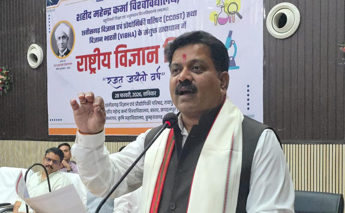 रायपुर: राष्ट्रीय विज्ञान दिवस के अवसर पर जगदलपुर में आयोजित कार्यक्रम में उप मुख्यमंत्री श्री विजय शर्मा मुख्य अतिथि के रूप में शामिल हुए। यह समारोह शहीद महेंद्र कर्मा विश्वविद्यालय, छत्तीसगढ़ विज्ञान एवं प्रौद्योगिकी परिषद तथा विज्ञान भारती के संयुक्त तत्वाधान में कृषि महाविद्यालय के सभागार में आयोजित किया गया। कार्यक्रम में विज्ञान के क्षेत्र में नवाचार, शोध एवं वैज्ञानिक सोच को बढ़ावा देने पर विशेष जोर दिया गया।
