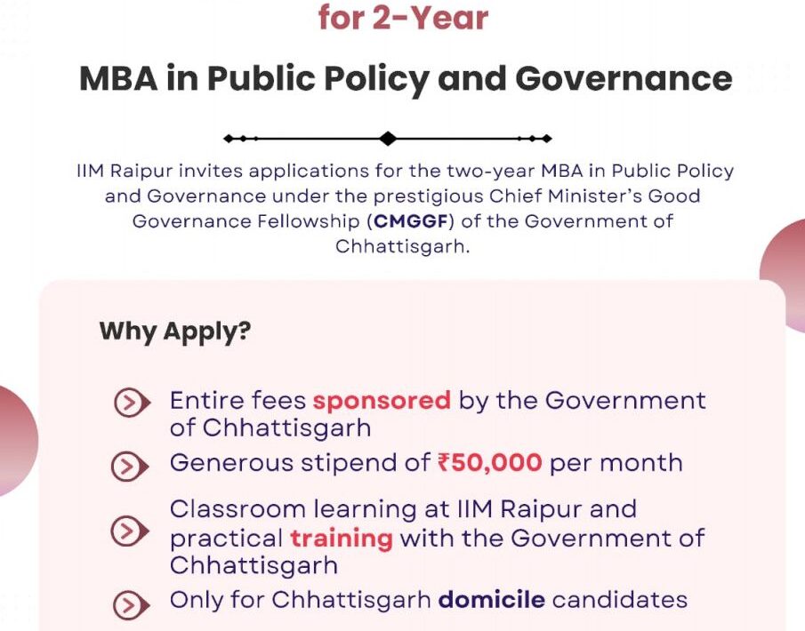 यह फेलोशिप विशेष रूप से छत्तीसगढ़ के मूल निवासियों के लिए उपलब्ध है तथा इसमें राज्य शासन की आरक्षण नीति लागू होगी। इच्छुक अभ्यर्थी विस्तृत जानकारी एवं आवेदन के लिए IIM रायपुर की आधिकारिक वेबसाइट पर निर्धारित तिथि तक आवेदन कर सकते हैं।